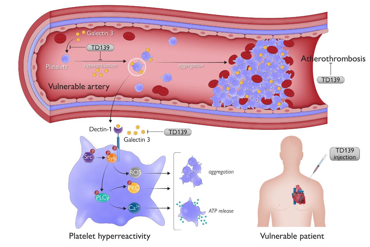 近日,欧洲心脏协会会刊European Heart Journal(IF=29.983)以Research Article在线发表了欧美A片 胡亮团队最新研究成果-“Galectin 3 enhances platelet aggregation and thrombosis via Dectin-1 activation: a translational study”,首次提出: (1)Galectin-3结合血小板膜表面的C型凝集素Dectin-1受体,促进血小板聚集和血栓形成。(2)TD139作为一种II期临床试验中应用的Galectin-3抑制剂,能抑制Galectin-3介导的血小板活化和血栓形成,且不加剧出血风险。(3)靶向Galectin-3可能作为心血管疾病治疗的新策略。针对Galectin 3/Dectin-1信号通路,研究团队发现柑橘果胶和β-葡聚糖等多个具有优秀的抗血小板作用的天然活性产物。