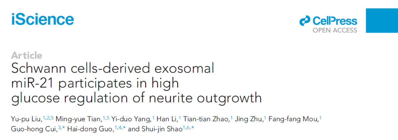 近日,我校中西医结合研究院国海东研究员和基础医欧美A片 邵水金教授团队在探索参与影响糖尿病周围神经病变(Diabetic peripheral neuropathy, DPN)的调节分子及潜在作用机制方面取得新的进展,该研究成果Schwann cells-derived exosomal miR-21 participates in high glucose regulation of neurite outgrowth 发表在Cell子刊iScience杂志上。