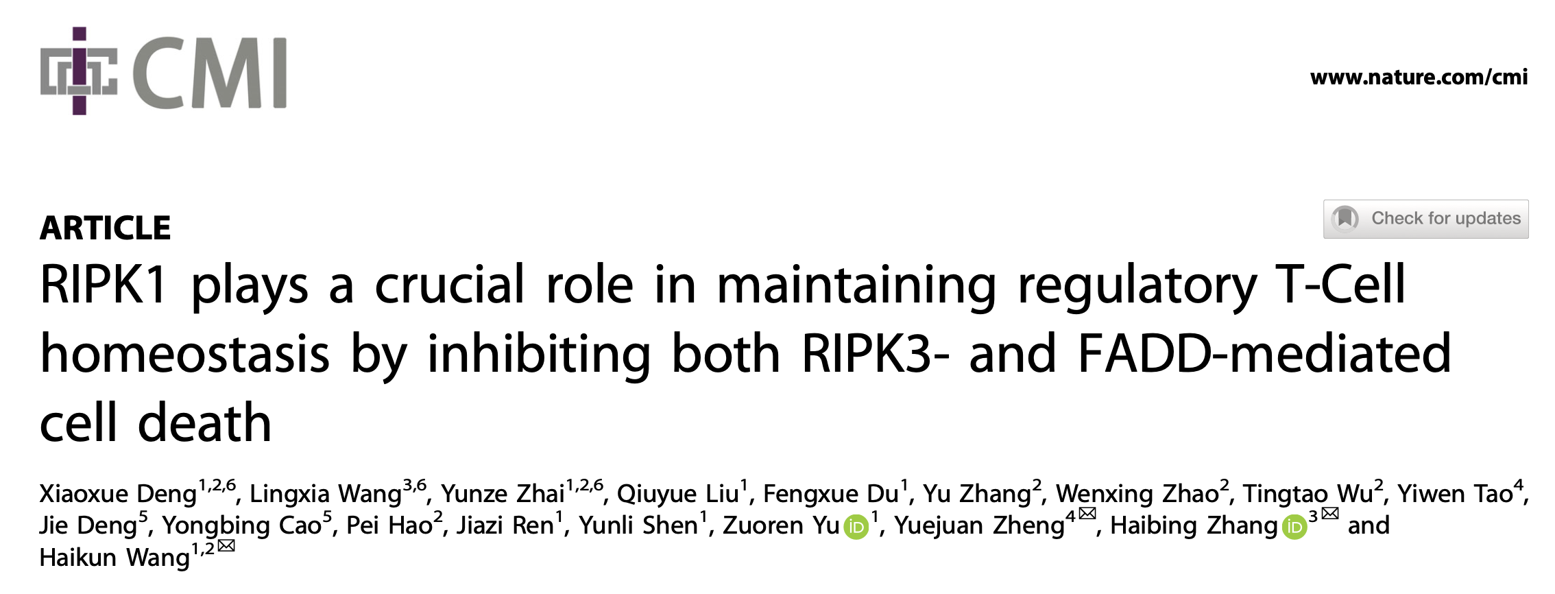 国际著名学术期刊Cellular & Molecular Immunology(SCI 1区,IF=24.10)在线发表了上海中医药大学郑月娟课题组与同济大学附属东方医院王海坤课题组、中国科欧美A片 章海兵课题组合作的研究论文“RIPK1 Plays a Crucial Role in Maintaining Regulatory T Cell Homeostasis by Inhibiting both RIPK3 and FADD-Mediated Cell Death”,该研究发现受体相关蛋白激酶1(receptor-interacting protein kinase 1,RIPK1)在维持Treg细胞和常规CD4+ T细胞(Tconv)的稳态的机制不同,Treg细胞中RIPK1蛋白通过抑制FADD和RIPK3介导的凋亡和坏死促进Treg细胞的存活,而在常规CD4+ T细胞中,RIPK1主要通过抑制凋亡促进 CD4+ T细胞的存活。