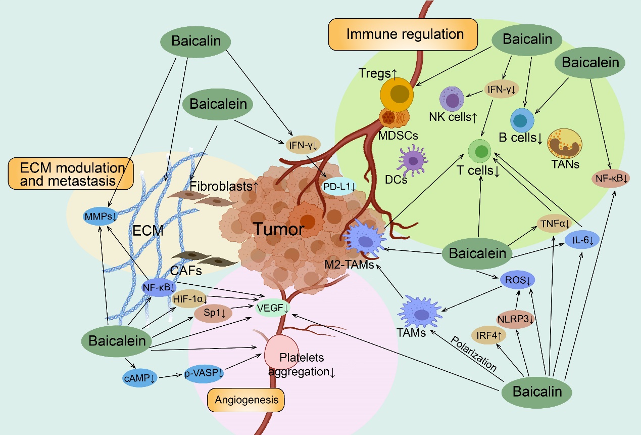 图2.黄芩苷和黄芩素在调控肿瘤微环境中的作用机制
