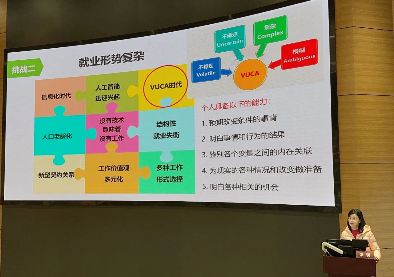 讲座伊始,张瑛老师以娓娓道来的方式,分析学校往届毕业生的职业发展方向,提出生涯规划首先要认清形势,她指出,当前就业市场存在毕业生人数总量大、就业形势复杂、结构性矛盾突出这三大挑战。