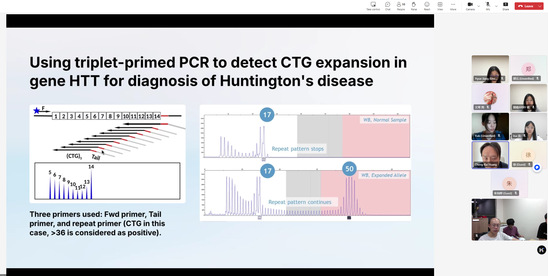 黄政凯博士深耕于非编码RNA和端粒生物学领域,在此次研讨会中,黄博士重点分析了新一代测序(NGS)、聚合酶链式反应(PCR)等分子生物学检测技术在罕见病和遗传性疾病诊断中的实际应用,如采用三核苷酸引物PCR技术检测HTT基因CTG重复序列扩增以诊断亨廷顿舞蹈症,并结合中医理论与中医诊断学分析了体外诊断技术在中医药领域的应用潜力。黄博士的介绍深入浅出,通俗易懂却又不乏专业性,赢得了与会师生的一致好评。