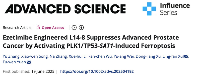 近日,欧美A片袁富文研究员团队联合交叉科学研究院张宇、安徽医科大学第一附属医院徐凌凡在Advanced Science发表题为“Ezetimibe Engineered L14-8 Suppresses Advanced Prostate Cancer by Activating PLK1/TP53-SAT1-Induced Ferroptosis”的研究成果。该研究基于降脂药依折麦布(Ezetimibe)开发出一种可高效抑制耐药性前列腺癌的新型小分子化合物L14-8。该药物通过激活铁死亡(ferroptosis)通路杀死癌细胞,且在动物实验中未显示明显毒性,为晚期前列腺癌患者提供了独立于雄激素受体(AR)信号通路的新治疗策略。