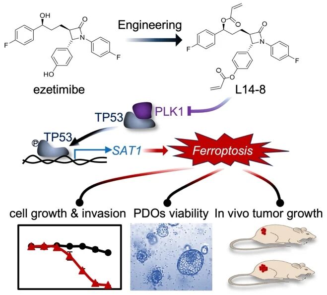 研究团队通过光化学合成技术快速构建包含461种化合物的分子库,并从中筛选出降脂药依折麦布的衍生物L14。经结构优化后获得活性更强的L14-8。L14-8在耐药性前列腺癌细胞模型中IC₅₀<10 μM,25 μM剂量下癌细胞死亡率超80%,但对正常前列腺细胞无显著毒性,在患者来源的类器官模型中,L14-8的抑瘤效果显著优于现有药物恩杂鲁胺。L14-8结合并降解关键蛋白PLK1,激活TP53磷酸化,进而促进铁死亡诱导因子SAT1的转录,通过SAT1触发脂质过氧化,最终诱导癌细胞铁死亡。L14-8与低剂量ARSI药物联用可显著增强抑瘤效果,有望解决临床耐药问题。小鼠模型中,L14-8治疗显著抑制肿瘤生长,且心、肝、肾等主要器官未出现明显损伤。该研究不仅提供了新型候选药物L14-8,更揭示了PLK1-TP53-SAT1轴作为前列腺癌治疗新靶点的潜力。尤其对AR信号失活的NEPC患者,L14-8有望成为潜在的有效靶向治疗方案。