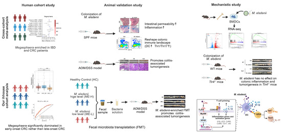 团队首先从已发表的多组临床队列中发现肠道菌属Megasphaera在炎症性肠病(IBD)及结直肠癌(CRC)中明显富集。随后,通过Megasphaera elsdenii (M. elsdenii)单菌定植实验发现M. elsdenii能够重塑小鼠结肠黏膜固有层免疫细胞群,诱导树突状细胞(DC)成熟,并促进促炎性Th1及Th17细胞分化,加重结肠炎性反应。在机制上,M. elsdenii通过LPS/TLR4/IRF4通路诱导DC细胞成熟。进一步在AOM/DSS炎性肠癌发生模型中,证实M. elsdenii诱导DC细胞成熟,促进Th1及Th17细胞分化,进而加重炎性肠癌肿瘤负荷,并且在Tlr4-/-小鼠中证明这种促癌机制依赖于TLR4介导。最后,依托复旦大学附属肿瘤医院结直肠癌人群队列,团队发现肠道菌属Megasphaera尤其在早发型结直肠癌(年龄<50岁)富集更为明显。通过采用高表达M. elsdenii结直肠癌患者粪菌移植,证实M. elsdenii丰度高的肠癌患者粪菌移植加重AOM/DSS小鼠肿瘤负荷及病理改变,进一步验证了M. elsdenii通过加重肠黏膜免疫炎性反应促进炎性结直肠癌发生。
