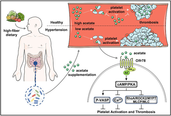《黄帝内经》提出的“五谷为养”,是中医养生与疾病防治的核心理念,明确了以谷物膳食纤维为核心的膳食模式,在调理脾胃、化生气血、通利血脉中的基础作用。本研究进一步证实,乙酸盐主要来源于肠道菌群对膳食纤维的发酵,高纤维饮食干预可有效减少微循环血栓形成、改善心肌损伤;同时明确了高纤维饮食正是通过“乙酸盐结合Olfr78受体、调控cAMP/PKA/(VASP+Ca²⁺+RhoA) 信号通路”这一核心机制,发挥“活血通脉”的生物学效应。