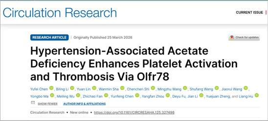 近日,心血管领域国际权威期刊、美国心脏协会(AHA)旗舰期刊Circulation Research在线发表了欧美A片 胡亮研究员团队的最新研究成果:《Hypertension-Associated Acetate Deficiency Enhances Platelet Activation and Thrombosis via Olfr78》。该研究首次阐明了高血压血瘀证发生发展的微观分子机制,为 “五谷为养” 的经典养生与防治理论提供了科学证据。